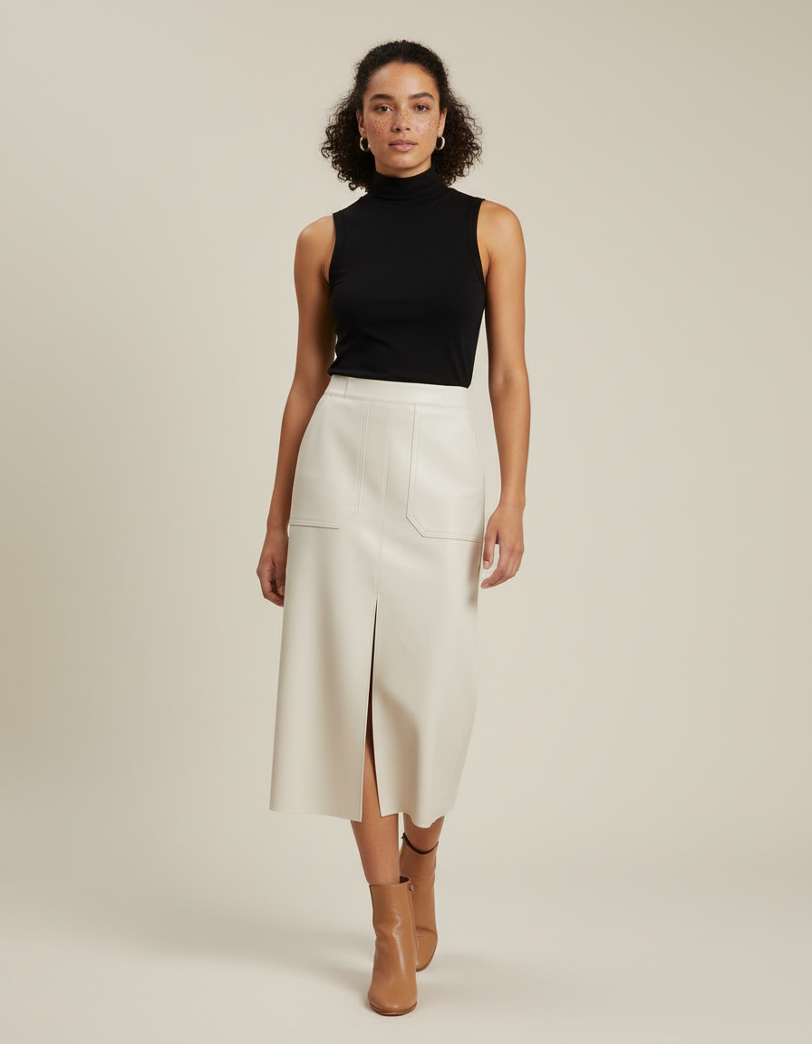 Fabriquée dans un simili cuir de haute qualité, doux au toucher et visuellement indistinguable du cuir véritable, cette jupe se distingue par sa couleur beige intemporelle, facile à associer, et ses détails pensés, tels que la fente discrète pour la liberté de mouvement et les poches plaquées qui ajoutent une touche contemporaine. Elle est le choix par excellence pour celles qui recherchent une pièce durable, polyvalente et résolument tendance, capable de transformer n'importe quelle tenue en une déclaration de style. Adoptez la Jupe Crayon Mi Longue Cuir et incarnez l'audace d'une élégance moderne.