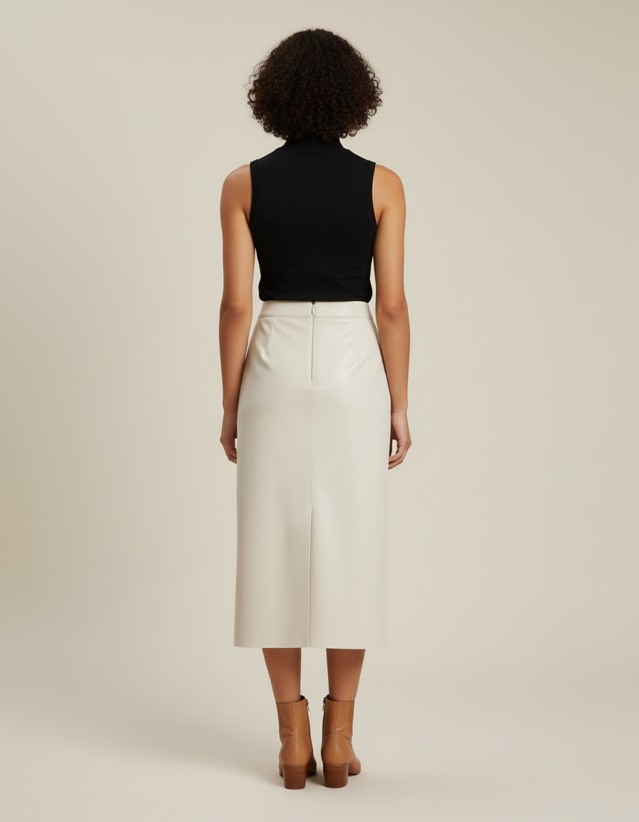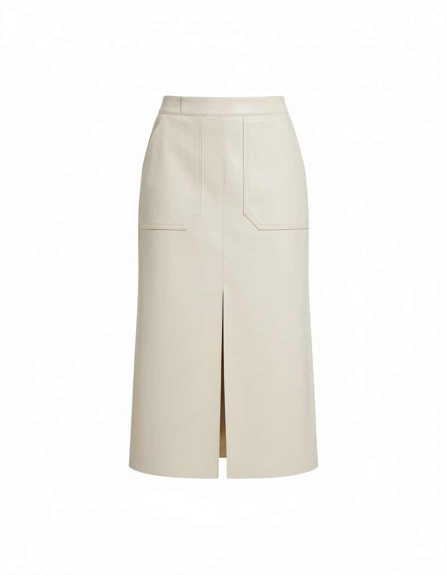 Jupe Crayon Mi Longue Crème avec Fente Avant Jupe Cuir