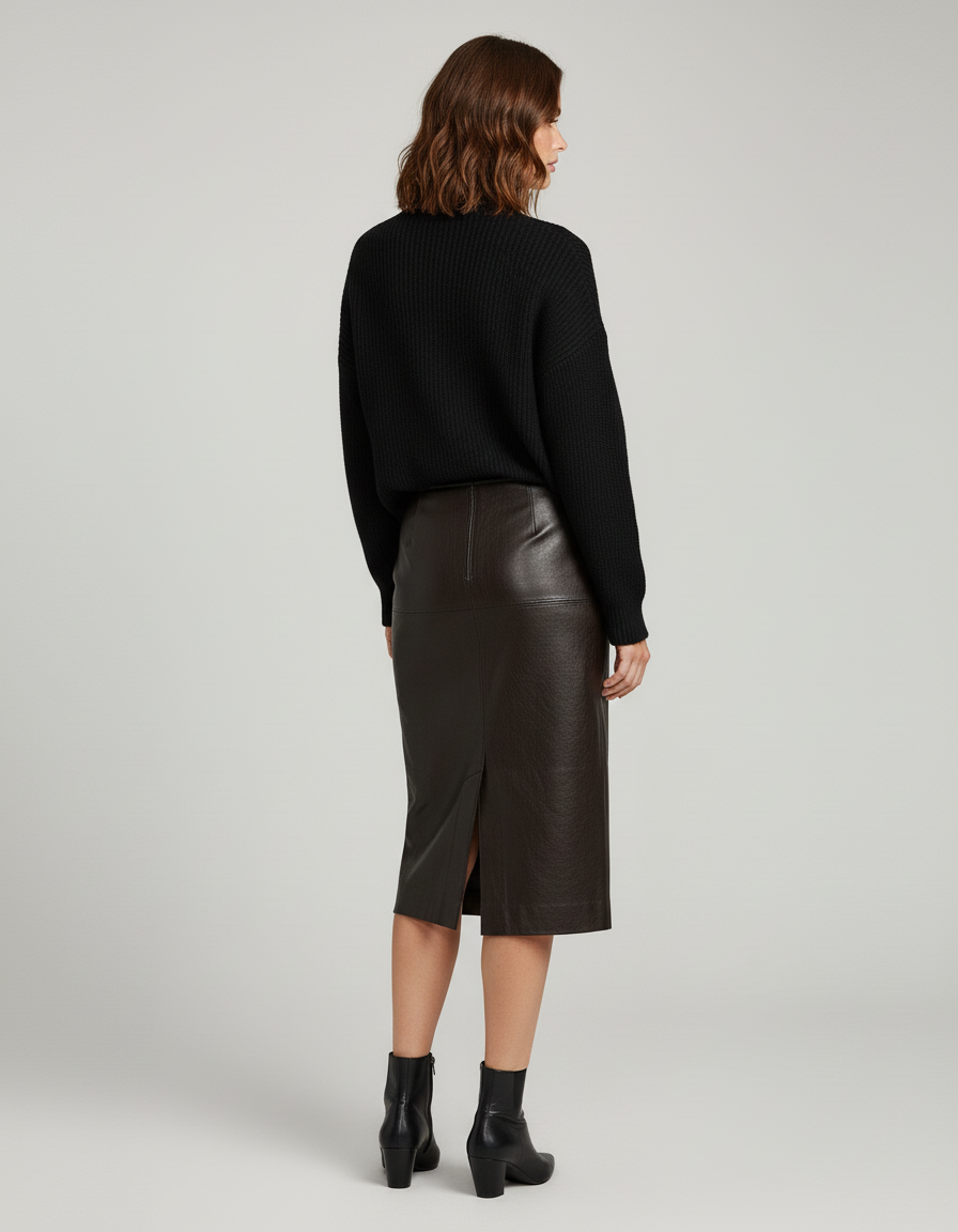 Notre Jupe Crayon en Cuir Brun est la pièce maîtresse d'une garde-robe chic et fonctionnelle. Confectionnée dans un cuir souple et richement teinté, elle offre une silhouette raffinée et intemporelle. Idéale pour le bureau, elle se marie parfaitement avec un chemisier en soie crème et des escarpins pour une allure professionnelle impeccable. Pour une touche plus décontractée mais toujours élégante, associez-la à un pull en maille fine et des bottines, comme sur notre visuel, pour un confort sans compromis tout au long de la journée.