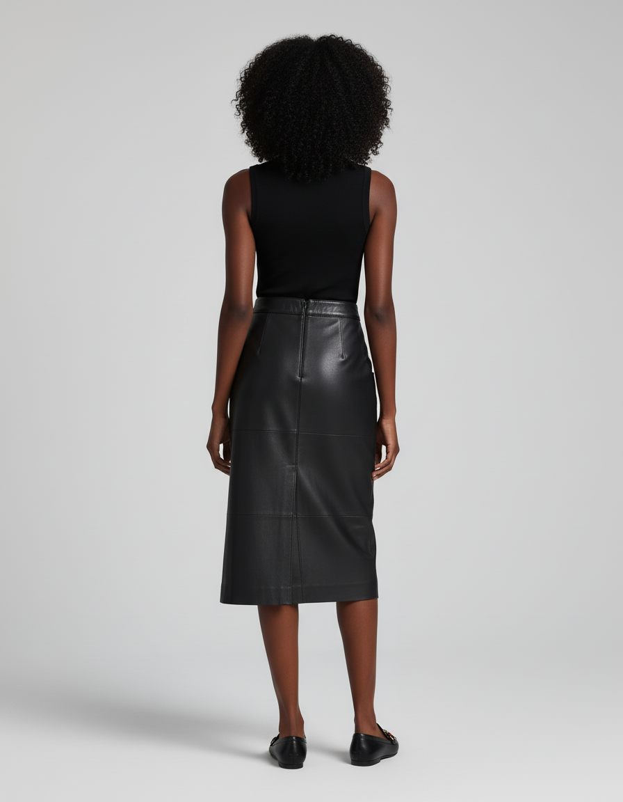 Confectionnée dans un cuir d'une souplesse exceptionnelle, cette jupe midi épouse vos formes avec une douceur inattendue. Oubliez les contraintes : sa coupe étudiée et sa fente stratégique garantissent une liberté de mouvement totale, vous permettant de vous déplacer avec aisance et confiance tout au long de la journée. Le tombé impeccable de la jupe met en valeur votre silhouette, tandis que les détails de la fermeture et des poches ajoutent une touche structurelle et premium. Un vêtement pensé pour votre confort, sans jamais sacrifier le style.