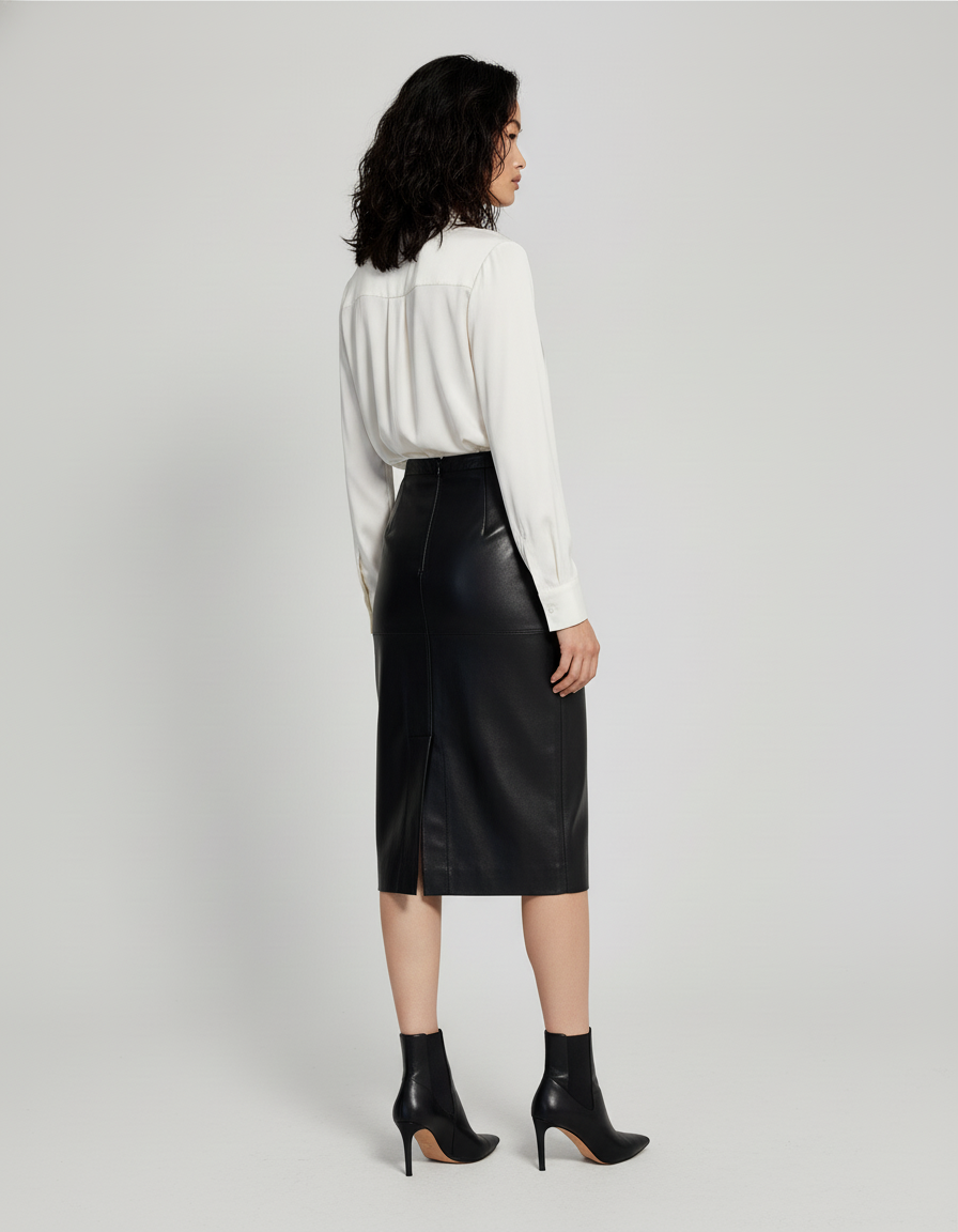 La Jupe Crayon en Cuir 'Fermeture Éclair' noir est la pièce maîtresse d'une garde-robe moderne et sophistiquée. Pour un look professionnel impeccable, associez-la à une blouse en soie fluide et un blazer ajusté, complété par des escarpins élégants. Sa fermeture éclair frontale, à la fois fonctionnelle et audacieuse, apporte une touche contemporaine. En soirée, troquez votre blouse pour un top délicat et rehaussez votre tenue avec des accessoires scintillants, transformant instantanément votre allure pour un dîner ou un événement chic. Elle s'adapte à toutes vos envies, sans jamais compromettre l'élégance.