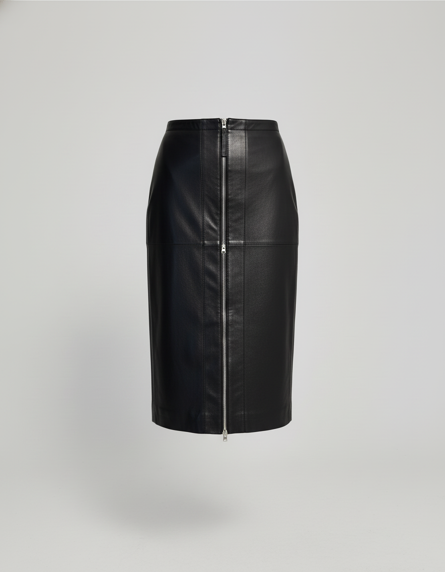 Ajoutez une touche audacieuse et moderne à votre collection avec notre jupe en cuir à fermeture éclair frontale.