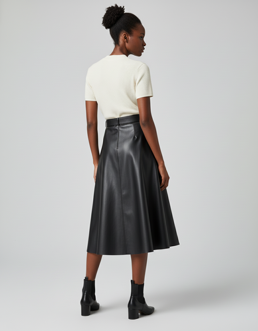 Jupe Cuir Noire Évasée Midi Jupe Cuir Genou