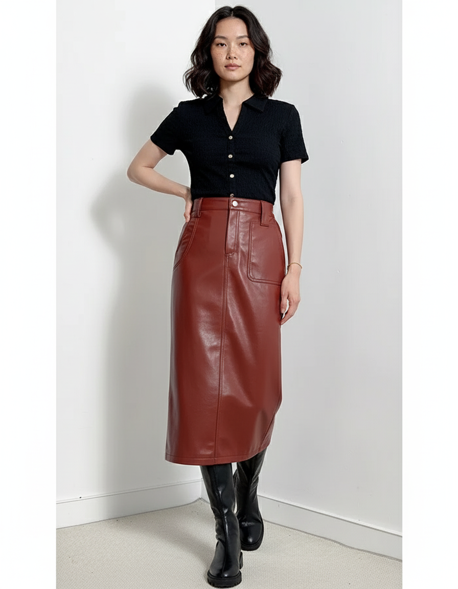 La Jupe Droite en Cuir Bordeaux se révèle être une pièce maîtresse de votre garde-robe professionnelle. Pour un look bureau impeccable, associez-la à un chemisier en soie crème ou une maille fine noire, complété par des escarpins classiques. En soirée ou pour un événement plus décontracté mais chic, transformez votre tenue en optant pour un top plus audacieux et des bottes hautes, comme sur l'image, pour une allure sophistiquée et tendance. Sa couleur bordeaux riche apporte une touche de caractère tout en restant facile à coordonner avec une multitude de teintes.