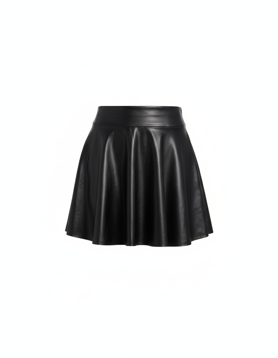 Cette jupe présente une coupe évasée de type patineuse avec des plis. Elle est de couleur noire, fabriquée en PU, et possède une taille haute.