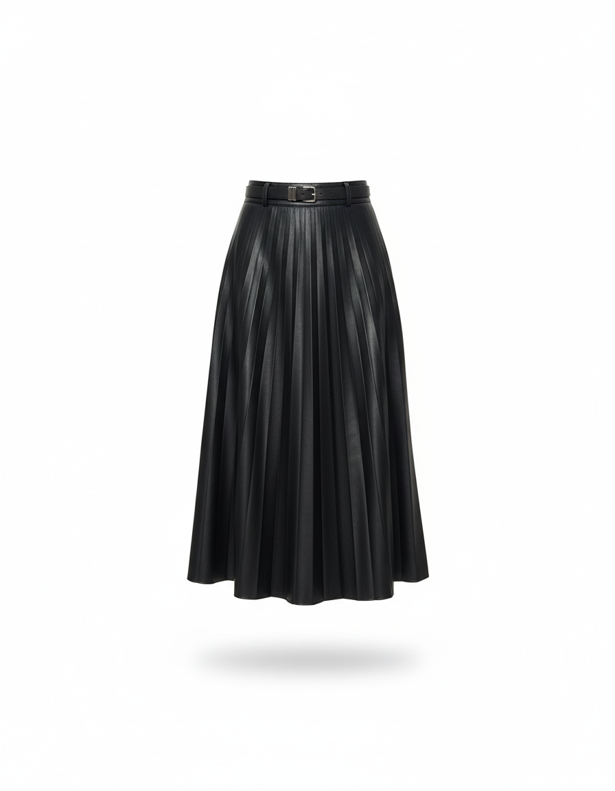 Adoptez un look sophistiqué et moderne avec notre jupe plissée en similicuir, un essentiel intemporel pour toutes les occasions.