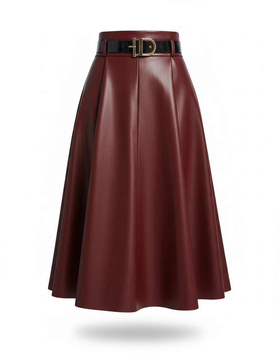 Découvrez notre jupe midi en cuir bordeaux, parfaite pour un look chic et intemporel.