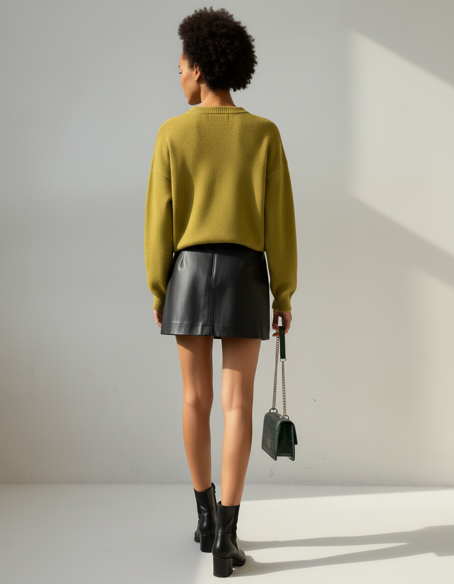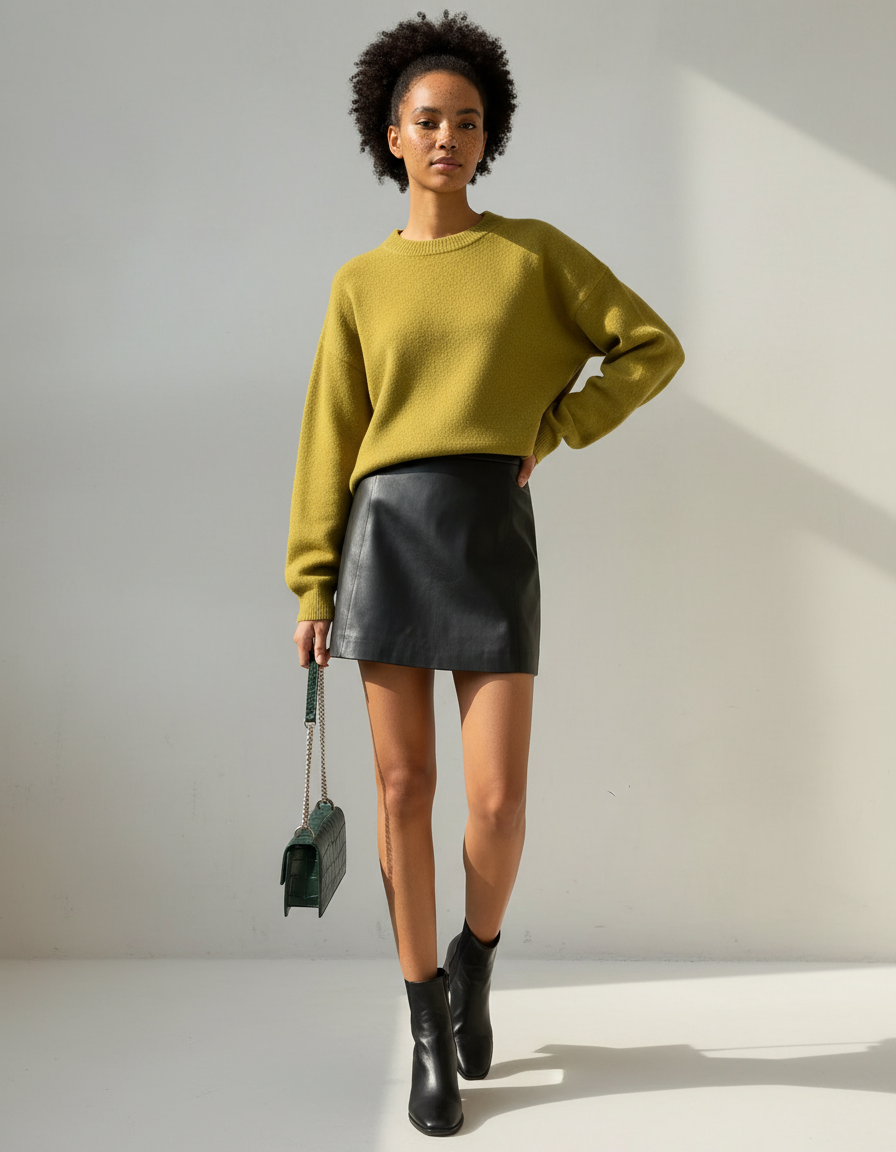 Polyvalente par excellence, la Jupe Cuir Noir s'adapte à toutes vos envies. Pour une sortie décontractée mais chic, associez-la à un pull oversize en maille fine et des bottines, comme sur cette image, complété par un sac à main structuré pour une touche de couleur. En soirée, transformez-la avec un top en soie fluide, des talons aiguilles et des bijoux délicats. Pour une allure plus audacieuse au bureau, osez le blazer ajusté et un col roulé. Elle est la toile de fond parfaite pour exprimer votre personnalité, garantissant toujours une élégance intemporelle.