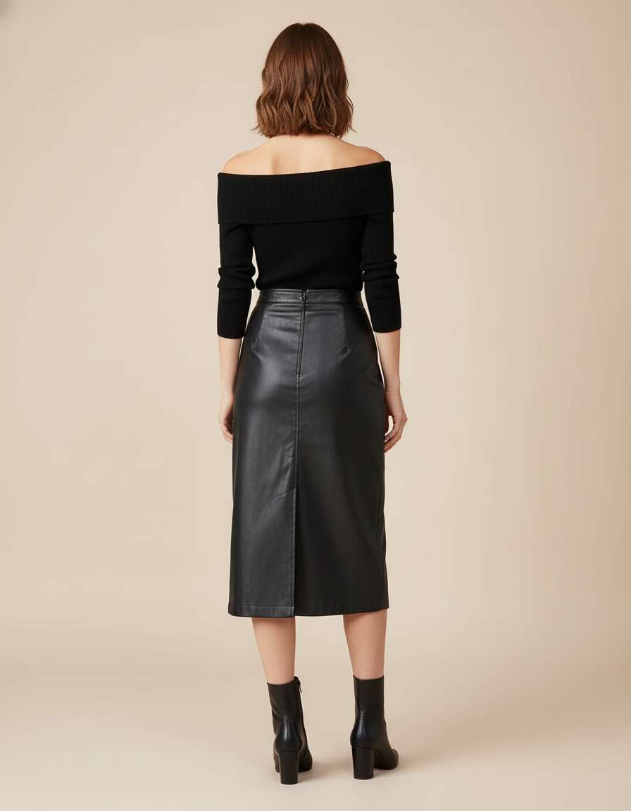 Caractéristiques de la Jupe Noire Midi - Jupe En Cuir Avec Fente