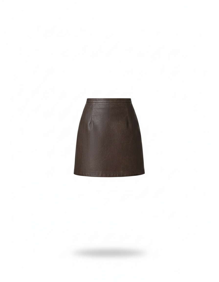 Cette jupe courte en **cuir** de couleur **marron foncé** présente une coupe légèrement trapèze. Elle se porte à la **taille haute** et arrive au-dessus du genou.
