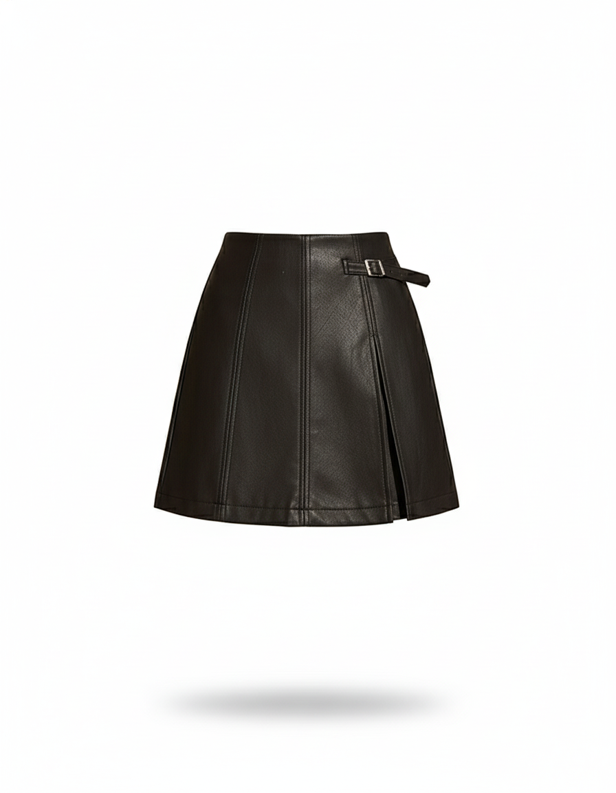 Cette jupe noire cuir femme présente une coupe évasée avec des plis sur le devant. Elle est munie d'un détail de boucle à la taille.
