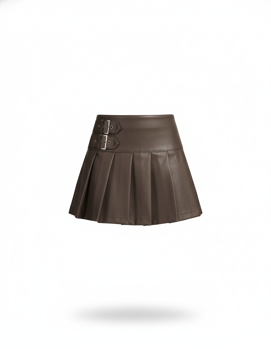 Cette jupe présente une coupe plissée et est confectionnée dans un matériau d'apparence cuir. Elle est de couleur marron et dispose de détails à boucles sur le côté.