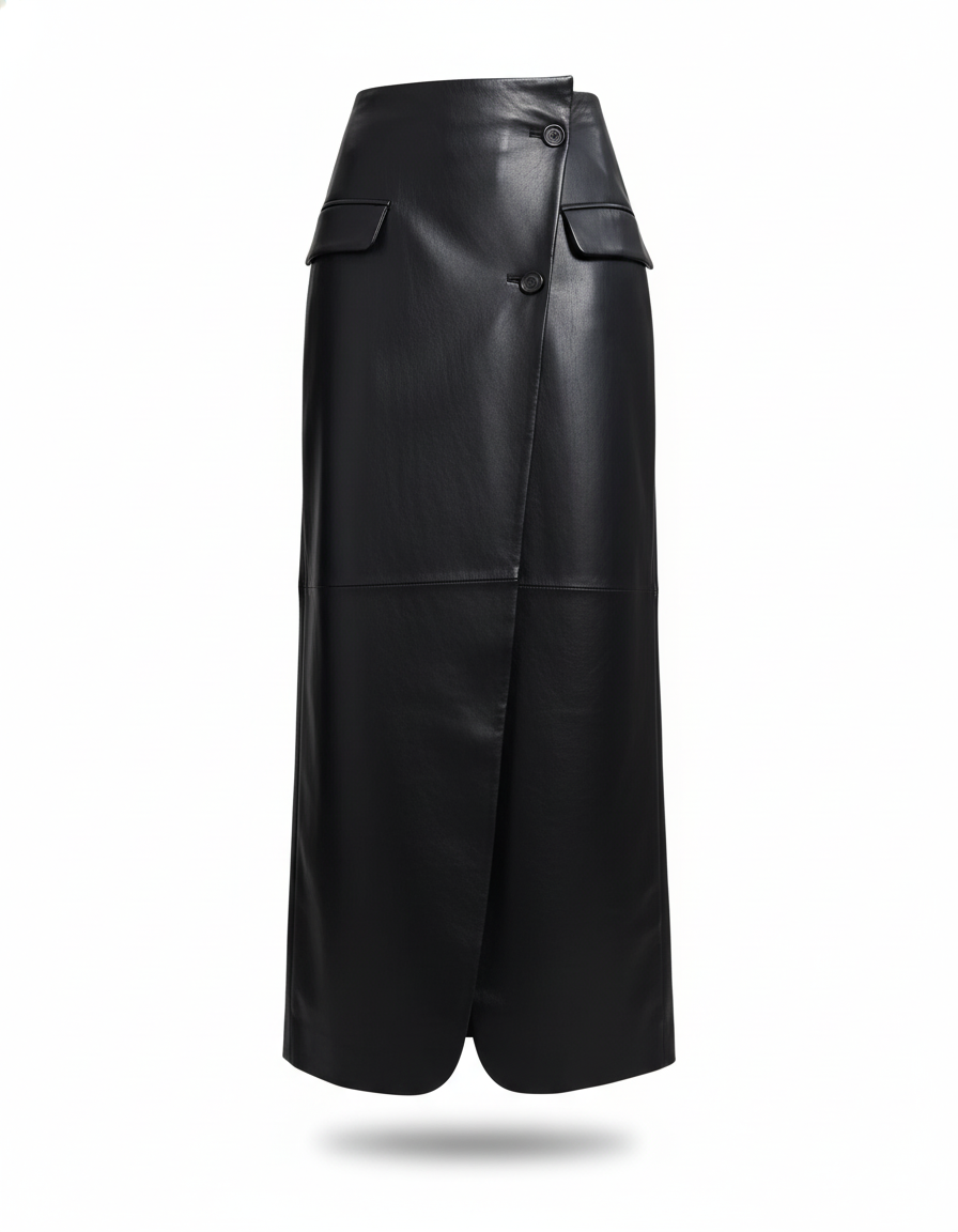 Une jupe portefeuille de couleur noire, confectionnée en cuir. Elle présente une coupe longue et une fermeture boutonnée sur le devant, complétée par deux poches à rabat.