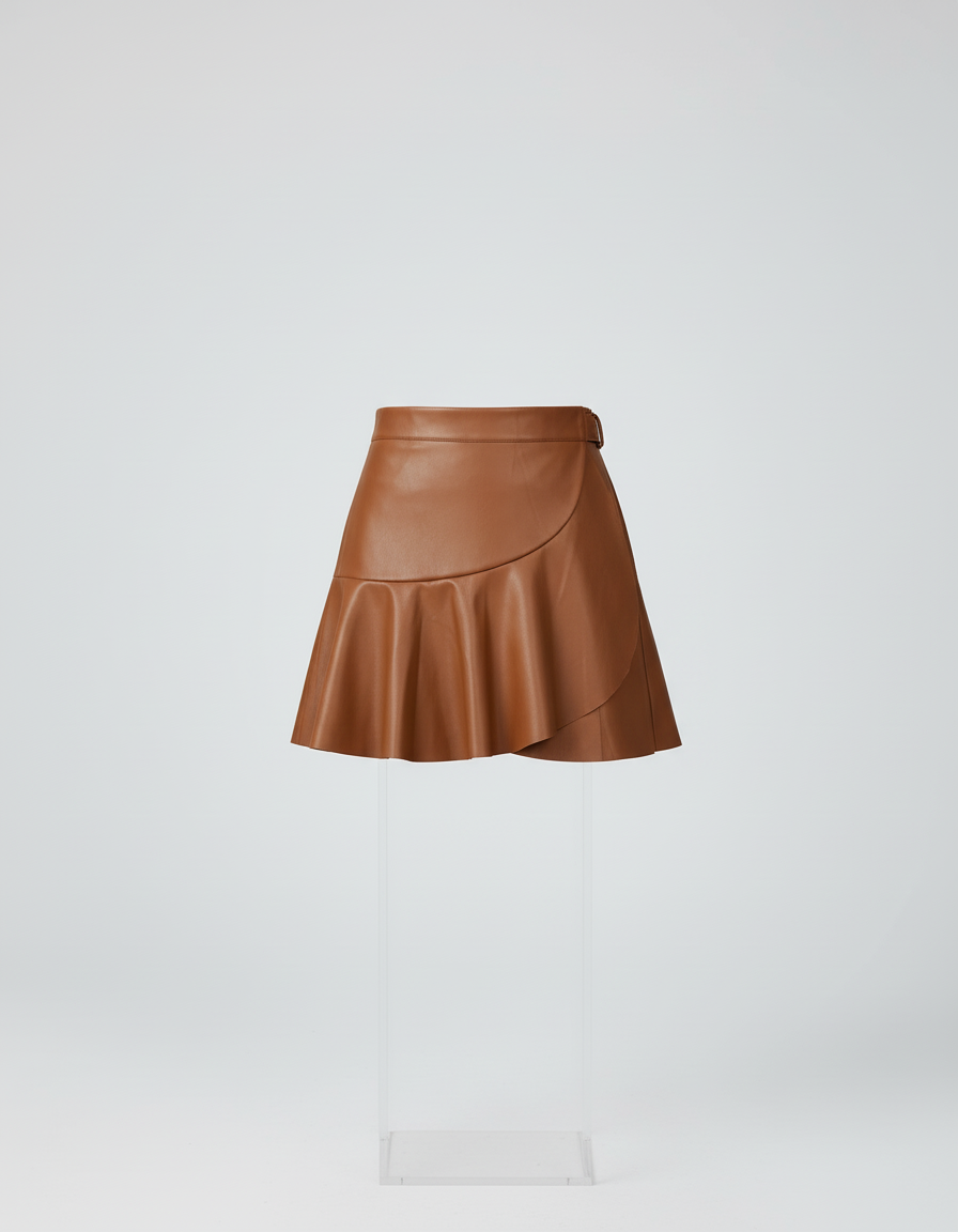 Cette jupe présente une coupe courte en simili cuir de couleur marron. Elle se caractérise par un design à volants et une silhouette évasée.