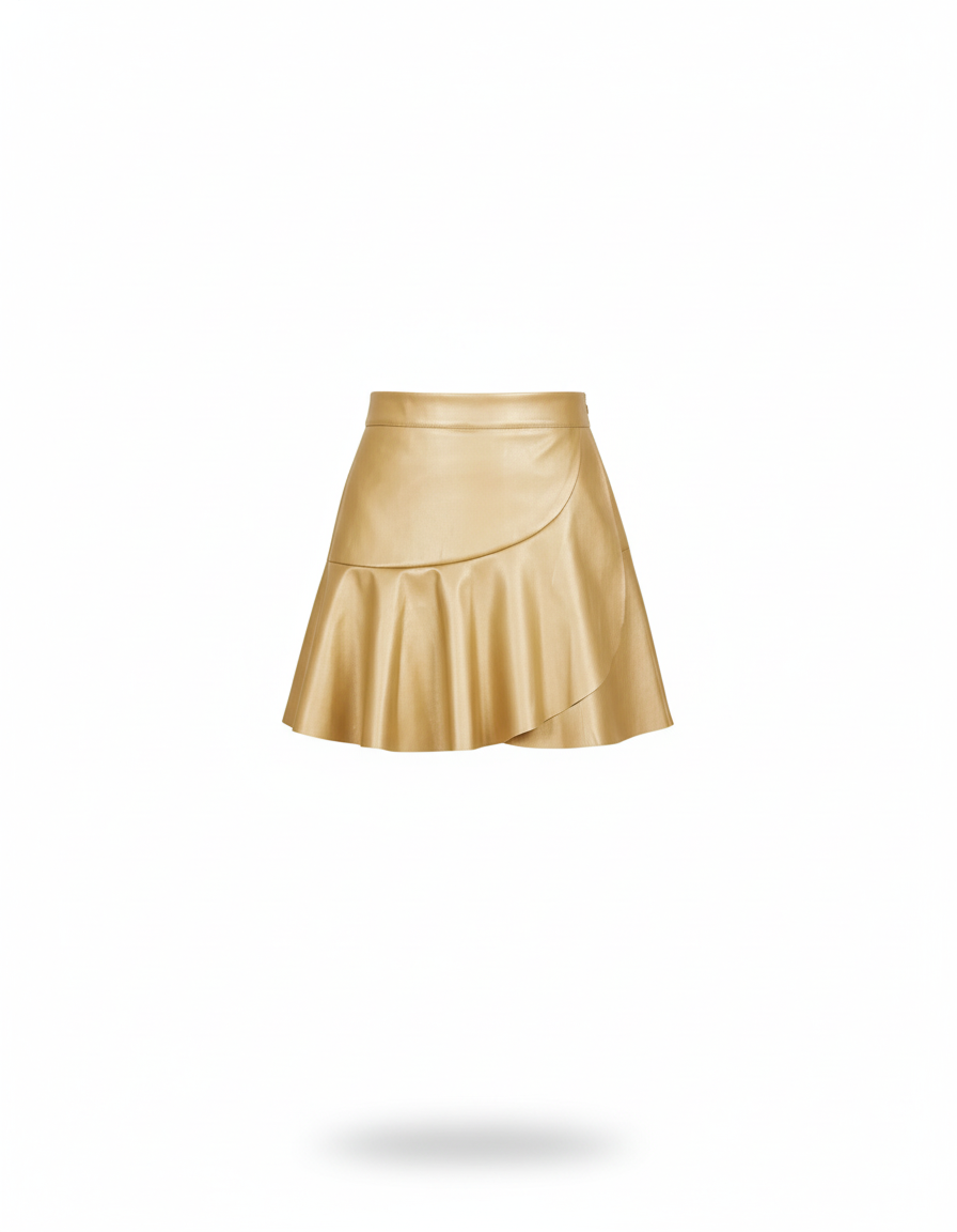 Cette **Jupe Simili Cuir Doré** est une mini-jupe en simili cuir de couleur dorée. Elle présente une coupe portefeuille avec un ourlet à volants.