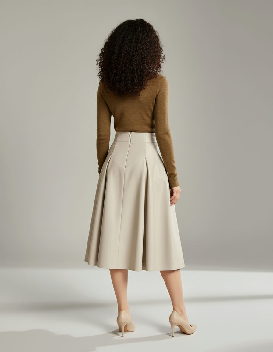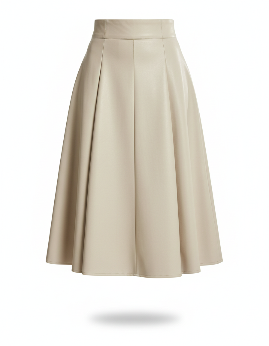 Cette jupe présente une coupe évasée, fabriquée dans un matériau qui imite le cuir. Elle est de longueur midi et de couleur beige clair.
