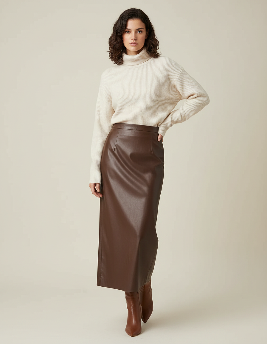 Ce qui distingue notre Jupe Tube Cuir, c'est son simili cuir de haute qualité, offrant un toucher doux et un tombé impeccable qui sublime la silhouette sans jamais contraindre. Sa coupe droite, intemporelle et flatteuse, associée à sa riche couleur marron, en fait un véritable caméléon stylistique. Facile à associer avec un pull en maille fine pour un look cosy-chic ou une blouse soyeuse pour une élégance plus formelle, elle est la promesse d'une garde-robe pensée pour durer et rayonner. Adoptez cette pièce emblématique et ressentez le luxe moderne à fleur de peau.
