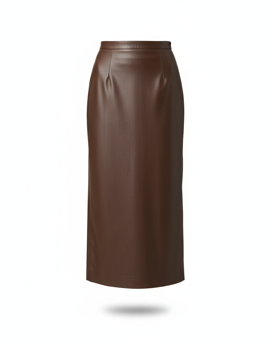 Cette jupe est une pièce longue de couleur marron, présentant une coupe droite de type tube. Elle est confectionnée dans une matière d'apparence cuir.